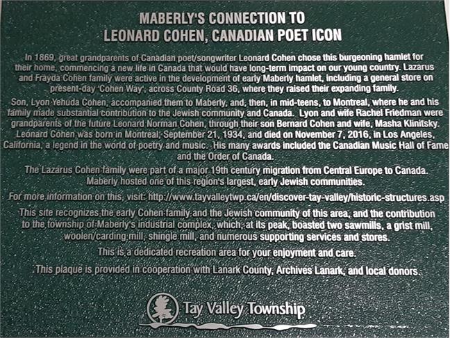 Maberly Heritage Plaque: The Leonard Cohen Connection (recognized May 19, 2020)