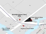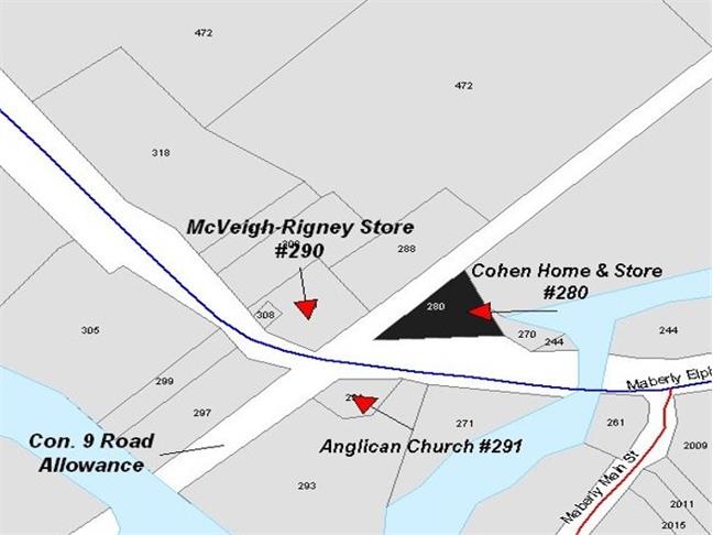 The Lazarus and Frayda Cohen family, active in the development of the early Maberly hamlet, owned a general store on the lots now listed as PIN Nos. 270 and 280, located at the junction of the road between Concessions 8 and 9 (now “Cohen Way”) and County Road 36. Lazarus was also a lumber merchant, presumably based out of the store, and had investments at various times in early Maberly properties, including the one eventually occupied by the Anglican Church and a property at about lot PIN #205. He also was hired as auditor for South Sherbrooke Township for the year 1882.